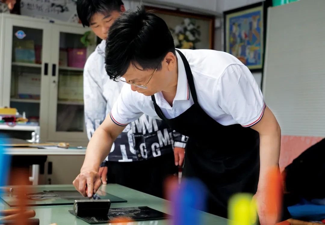 “刻板、研墨、鋪墨、拓印是制作版畫必不可少的流程,其中的關(guān)鍵就在刻板這一步?!泵俺卣诮o江蘇省如皋市特教學(xué)校的聾生們上版畫課,他手指翻飛教授,又拿起教具和自己的作品向同學(xué)們展示,雖然教室里只有5名聾生,他依然教得認(rèn)真細(xì)致,確保每個(gè)聾生都跟上他的思路。今年是冒朝霖在這里教書的第26年,也是他用刻刀和畫筆為如皋特校的聾生們打開藝術(shù)之窗的第26年。