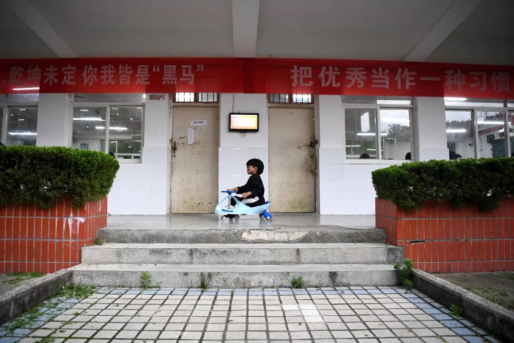 圖為2022年5月31日,張亮在校園里騎扭扭車
