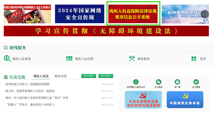 12月4日,當(dāng)?shù)?3個“12.3國際殘疾人日”遇上第11個“12.4國家憲法日”,中國殘聯(lián)在官方網(wǎng)站首頁正式開通殘疾人權(quán)益保障法律法規(guī)規(guī)章信息公開系統(tǒng),將我國憲法、現(xiàn)行有效的法律、行政法規(guī)和部分地方性法規(guī)、地方政府規(guī)章中涉及殘疾人權(quán)益保障的主要內(nèi)容集中進(jìn)行展示公開。
