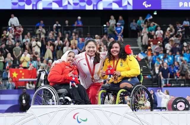 同在舉重賽場,女子67公斤級比賽中,里約、東京兩屆殘奧會金牌得主譚玉嬌接連打破世界紀(jì)錄。在奪冠后,她親吻了亞軍埃及選手埃利安和季軍巴西選手卡斯特羅的臉頰。