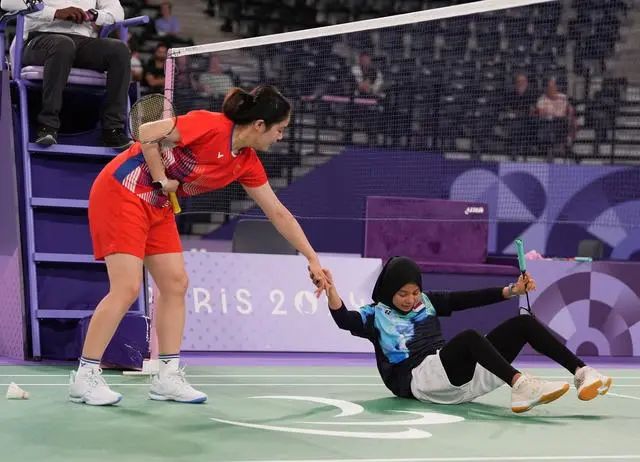 9月2日,羽毛球女子單打SL3級決賽,肖祖賢戰(zhàn)勝印度尼西亞選手沙庫爾奧奪冠。鏡頭定格下沙庫爾奧比賽中摔倒在地,肖祖賢伸手將她攙扶起的瞬間,成為本屆殘奧會的暖心一刻。