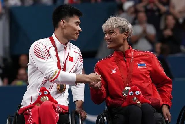 8月31日,中國運動員曹寧寧(左)在巴黎殘奧會乒乓球男雙8級頒獎儀式上與季軍泰國選手格林班春(右,音譯)握手。新華社記者 侯昭康 攝