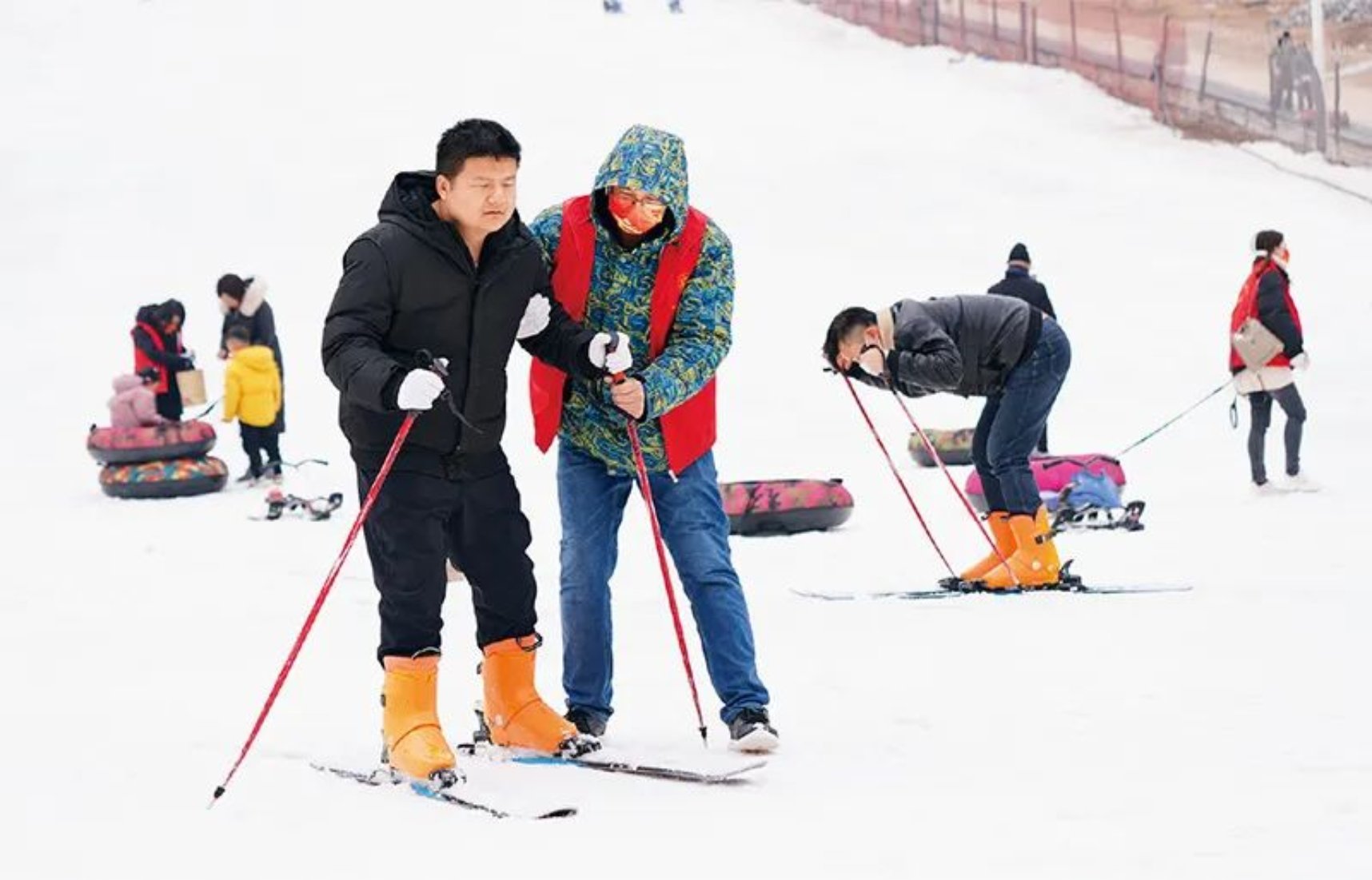 2022年2月18日,以“擁抱冬殘奧,熱情迎嘉賓”為主題的第六屆全國殘疾人冰雪運動季示范活動(河南站),在河南滎陽九龍口滑雪場舉行。百余名盲人和志愿者參加活動,體驗雪地拔河、雙板滑雪、雪地車等冰雪項目。這是一位盲人在志愿者幫助下體驗滑雪運動。視覺中國 馬健/攝