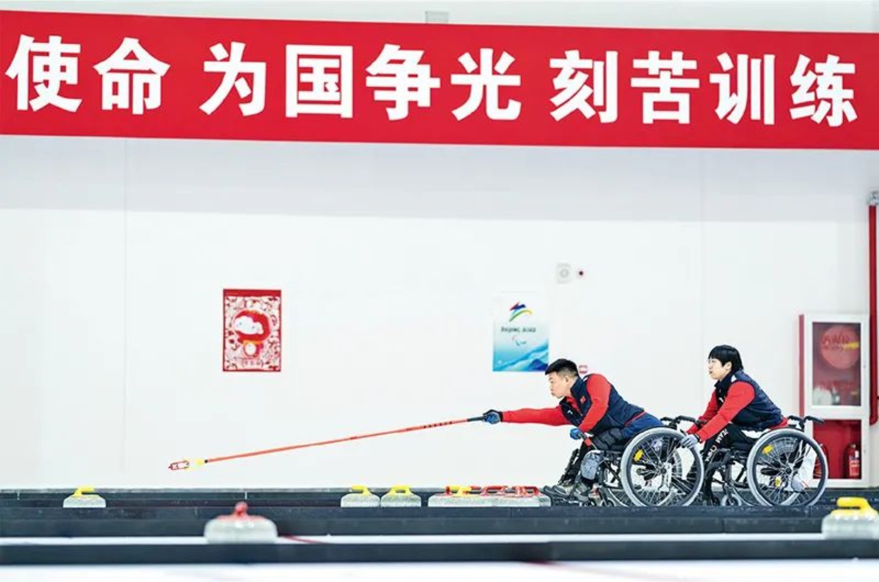 北京2022年冬殘奧會將于3月4日開幕。這是2021年12月23日,在位于北京順義的國家殘疾人冰上運動比賽訓(xùn)練館,中國輪椅冰壺隊隊員抓緊進行訓(xùn)練,為北京冬殘奧會做最后的準(zhǔn)備。新華社記者 才揚/攝