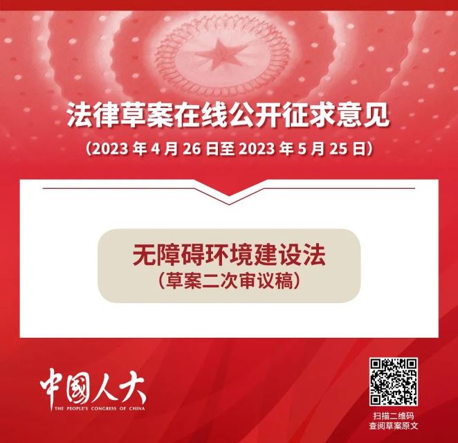 今天起,無障礙環(huán)境建設(shè)法草案二次審議稿公開征求意見,截止日期為2023年5月25日。