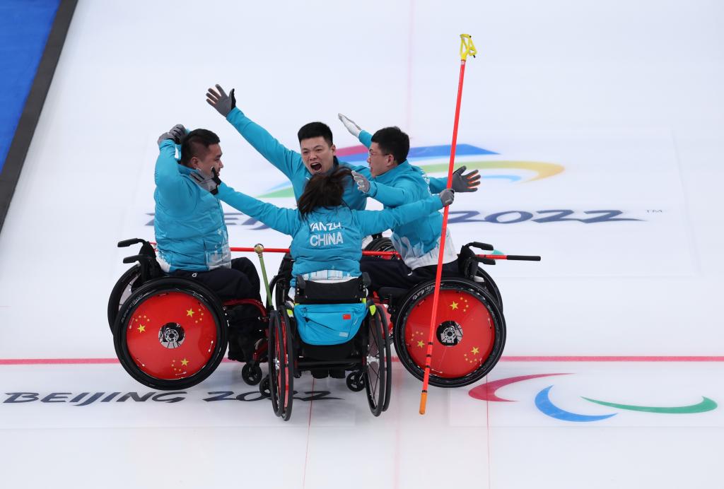 3月12日,中國(guó)隊(duì)選手在北京冬殘奧會(huì)輪椅冰壺金牌賽后慶祝。新華社發(fā)(胡星宇攝)