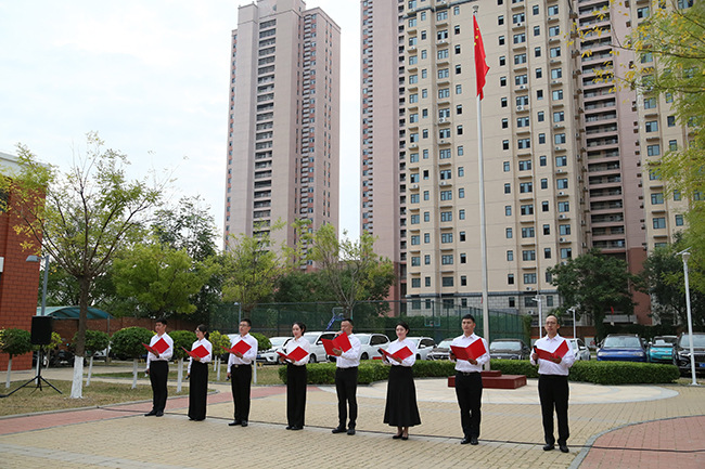 升旗儀式莊嚴(yán)熱烈。升旗手護(hù)旗手邁著鏗鏘有力的步伐護(hù)衛(wèi)國旗走向升旗臺,伴隨著莊嚴(yán)嘹亮的《義勇軍進(jìn)行曲》,鮮艷的五星紅旗冉冉升起,全體黨員干部群眾行注目禮、奏唱國歌;青年干部代表激情滿懷朗誦《人民就是江山》;全體干部職工集體合唱《歌唱祖國》,表達(dá)對祖國無限熱愛和崇高敬意。