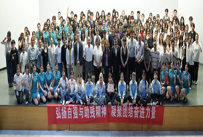 圖為天津市殘聯(lián)領(lǐng)導(dǎo)、天津理工大學(xué)校領(lǐng)導(dǎo)與演出大學(xué)生合影留念