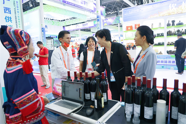 在廣西供銷大集展館,各類特色農副產品琳瑯滿目。黃麗娟來到助殘就業(yè)企業(yè)展位前,查看參展商品,聽取展銷會展位設置等情況介紹,并與參展企業(yè)代表親切溝通交流,對助殘就業(yè)產品生產、加工、銷售等情況進行了詳細了解。在助殘就業(yè)企業(yè)龍州縣大吉種植農民專業(yè)合作社的展位前,當黃麗娟了解到合作社社長農浩是一位殘疾人,通過自身努力創(chuàng)辦了葡萄酒釀造企業(yè),創(chuàng)新打造代表本地風味的優(yōu)質葡萄酒時,她對農浩自強不息的精神點贊,并鼓勵他繼續(xù)努力不斷把企業(yè)品牌做強做大。