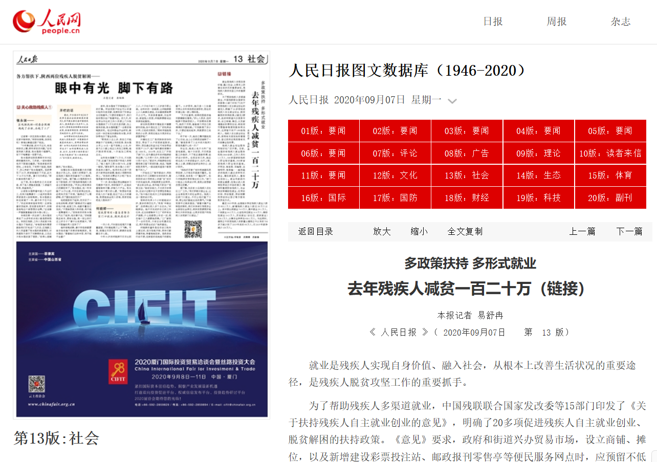 人民日報 多政策扶持 多形式就業(yè) 去年殘疾人減貧一百二十萬(鏈接)
