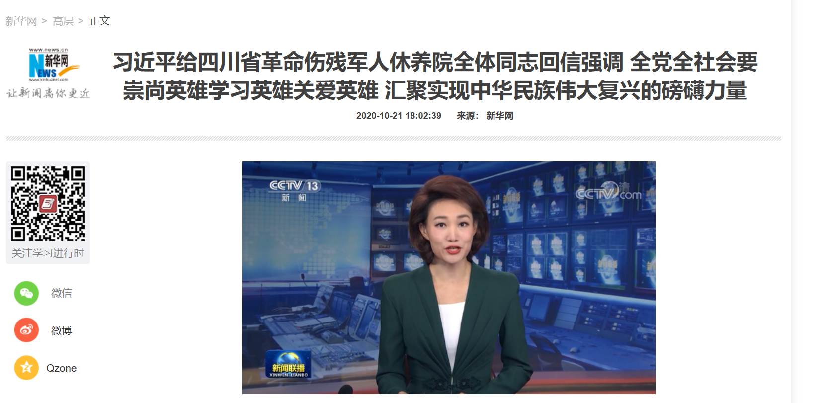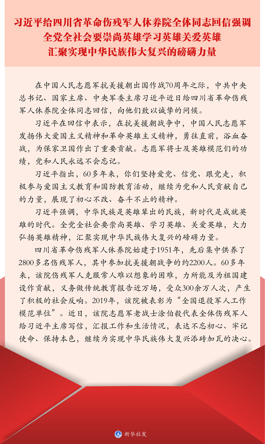 新華社 習近平給四川省革命傷殘軍人休養(yǎng)院全體同志回信強調 全黨全社會要崇尚英雄學習英雄關愛英雄 匯聚實現(xiàn)中華民族偉大復興的磅礴力量
