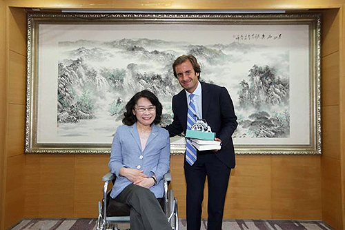 圖為中國(guó)殘聯(lián)主席、康復(fù)國(guó)際主席張海迪會(huì)見(jiàn)馬可·蘇比昂