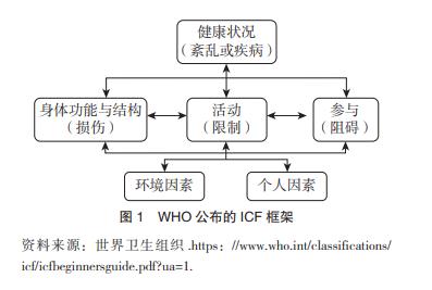 幾經(jīng)修訂后,WHO在2001年發(fā)布了《國際功能、殘障和健康分類》(ICF),對殘障的理解發(fā)生了明顯變化。從ICF為世人熟知的框架圖(圖1)可知,健康涵蓋兩大方面,一是由身體功能/結(jié)構(gòu)、活動、參與三位一體構(gòu)成的中心組件,二是由個人因素和環(huán)境因素構(gòu)成的背景條件。該框架沒有沿用ICIDH的三大區(qū)分,而是用“殘障”來統(tǒng)一表述身體、個人和社會三方面的狀態(tài)。任何的損傷(身體結(jié)構(gòu)和功能的改變)、活動受限(無法執(zhí)行任務(wù)或行動)、參與受阻(難以融入生活情境)均構(gòu)成殘障,個人因素(如性別、年齡、教育、職業(yè)、行為模式等)和環(huán)境因素(物理、社會和態(tài)度環(huán)境)均有可能發(fā)揮積極或消極的影響,雙向箭頭意味著殘障是身體、個人和環(huán)境之間相互作用的結(jié)果。該框架強調(diào)個體之外的社會因素對殘障的影響,被視為“超越醫(yī)學(xué)模式的嘗試”“醫(yī)學(xué)和社會模式的綜合”。不過,也有批評者認(rèn)為它仍舊忽視了總體的結(jié)構(gòu)性問題,如貧困、不平等與殘障之間的聯(lián)系,以及在挑戰(zhàn)政策和社會改變中的適用性不足等。