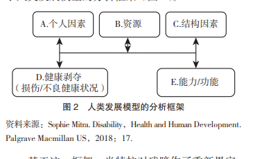 在前期能力分析的基礎(chǔ)上,米特拉于2018年出版了《殘障、健康與人類發(fā)展》一書,正式提出殘障分析的人類發(fā)展模型,被認(rèn)為是在理論和經(jīng)驗研究層面的開創(chuàng)性探索。該模型的目的是提供一個概念框架來理解殘障,描述和解釋健康剝奪及其原因和對福祉的影響。模型涉及的主要概念有5個方面:第一是能力與功能,人類發(fā)展模型繼承了能力理論中的這兩個核心概念,能力不是指日常生活意義上的技能素質(zhì),而是指“實際的機會”,功能是指“實際結(jié)果”或“成就”,它包括活動(如踢足球)以及人的狀態(tài)(如營養(yǎng)良好、承受壓力等),這兩個概念直通人的幸福和發(fā)展;第二是健康剝奪,參照WHO的界定,健康剝奪包括損傷(如視力受損)和不良健康狀況(如疾病、紊亂、癥狀或傷害);第三是資源,指個人擁有或可獲得的商品、服務(wù)、信息等,資源在人類發(fā)展模型中被看作一組重要而獨立的因素,具有轉(zhuǎn)化為人類福祉的多樣化潛能;第四是結(jié)構(gòu)因素,指影響個體的外在環(huán)境,包括物理環(huán)境、經(jīng)濟環(huán)境、法律和制度、社會態(tài)度、文化、產(chǎn)品和技術(shù)等;第五是個人因素,包括個體的年齡、性別、人格特征等。這些概念及其相互關(guān)系構(gòu)成了人類發(fā)展模型的分析框架(圖2)。