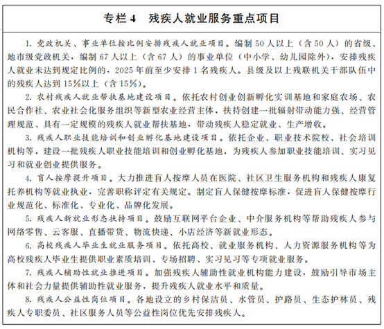 4.加強和改進殘疾人就業(yè)服務(wù)。健全殘疾人就業(yè)服務(wù)體系,充分發(fā)揮殘疾人就業(yè)服務(wù)機構(gòu)和各類公共就業(yè)服務(wù)平臺、人力資源服務(wù)機構(gòu)、社會組織作用,為殘疾人和用人單位提供全鏈條、專業(yè)化、精準(zhǔn)化服務(wù)。建立殘疾人就業(yè)輔導(dǎo)員制度,擴大就業(yè)輔導(dǎo)員隊伍。為高校殘疾人畢業(yè)生建立就業(yè)幫扶工作臺賬,按照“一人一檔”“一人一策”要求重點幫扶。將符合條件的就業(yè)困難殘疾人納入就業(yè)援助范圍,持續(xù)開展“就業(yè)援助月”等專項就業(yè)服務(wù)活動。加強各級殘疾人就業(yè)服務(wù)機構(gòu)規(guī)范化建設(shè),明確保障條件、專業(yè)人員配備等要求。通過政府購買服務(wù)等方式開展殘疾人就業(yè)服務(wù),拓寬服務(wù)渠道,擴大服務(wù)規(guī)模,提高服務(wù)質(zhì)量。舉辦殘疾人職業(yè)人才交流、殘疾人就業(yè)產(chǎn)品市場營銷、殘疾人就業(yè)創(chuàng)業(yè)成果展示等活動。