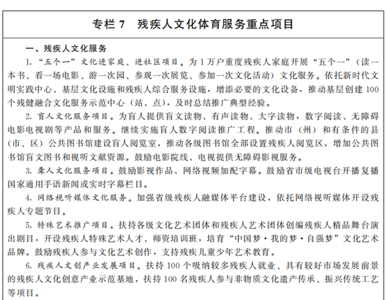 8.提高殘疾人公共文化服務(wù)供給能力。構(gòu)建較為完善的無障礙文化服務(wù)體系,做好殘疾人公共文化服務(wù)供給,激發(fā)殘疾人參與公共文化熱情,保障殘疾人的文化權(quán)益,推進基本公共文化服務(wù)均等化。支持殘疾人參加“書香隴原·閱讀有我”“華夏書屋”試點等公共文化活動,利用好殘疾人電子閱讀平臺,推動城鄉(xiāng)殘疾人無障礙共享“農(nóng)家書屋”等公共資源。開展“殘疾人文化季”等殘疾人群眾性文化活動,著力打造具有甘肅特色的殘疾人群眾性文化活動品牌。支持優(yōu)秀文創(chuàng)產(chǎn)品開發(fā)、交流與展示,依法依規(guī)支持建設(shè)殘疾人文創(chuàng)產(chǎn)業(yè)網(wǎng)絡(luò)平臺和銷售平臺。為殘疾人提供盲文和有聲讀物等無障礙文化服務(wù)。支持創(chuàng)編、演出殘疾人文化藝術(shù)作品,出版殘疾人文化藝術(shù)叢書。發(fā)展特殊藝術(shù),扶持特殊藝術(shù)人才和師資培養(yǎng),加大特殊藝術(shù)人才培養(yǎng)基地建設(shè)和殘疾人藝術(shù)團體建設(shè),積極參加特殊藝術(shù)交流活動,扶持殘疾人藝術(shù)團體開展基層巡演。組織參加第十屆、十一屆全國殘疾人藝術(shù)匯演,舉辦第九屆全省殘疾人藝術(shù)匯演。