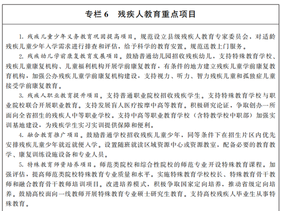 6.健全殘疾人教育體系。堅持立德樹人,促進殘疾兒童少年德智體美勞全面發(fā)展。制定實施《甘肅省第三期特殊教育提升計劃(2021—2025年)》。鞏固殘疾兒童少年義務(wù)教育,加快發(fā)展非義務(wù)教育階段特殊教育,積極發(fā)展學(xué)前特殊教育,支持普通幼兒園接收殘疾兒童,推動特殊教育學(xué)校和有條件的兒童福利機構(gòu)、殘疾兒童康復(fù)機構(gòu)普遍增設(shè)學(xué)前部或附設(shè)幼兒園,盡早為殘疾兒童提供適宜的保育、教育、康復(fù)、干預(yù)服務(wù)。健全普通學(xué)校隨班就讀支持保障體系,發(fā)揮殘疾人教育專家委員會作用,實現(xiàn)適齡殘疾兒童少年“一人一案”科學(xué)教育安置。著力發(fā)展以職業(yè)教育為重點的殘疾人高中階段教育,使完成義務(wù)教育且有意愿的殘疾青少年都能接受適宜的中等職業(yè)教育。穩(wěn)步推進殘疾人高等教育,積極爭取有條件的高校面向殘疾人考生開展單考單招、普通高校擴大殘疾人考生招生計劃,增加殘疾人接受高等教育的機會。開展殘疾人融合教育示范區(qū)、示范校和優(yōu)秀教育教學(xué)案例遴選。支持高校開展殘疾人融合教育。落實對家庭經(jīng)濟困難的殘疾學(xué)生(幼兒)從學(xué)前到高等教育全覆蓋的學(xué)生資助政策。為殘疾學(xué)生提供輔助器具、特殊學(xué)習(xí)用品、康復(fù)訓(xùn)練和無障礙等支持服務(wù),為殘疾學(xué)生參加國家教育考試和部分職業(yè)考試提供合理便利。