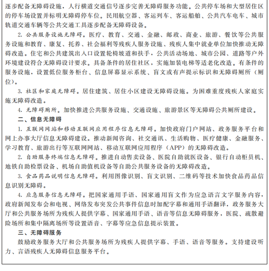 4.加快發(fā)展信息無障礙。將信息無障礙建設(shè)納入數(shù)字社會、數(shù)字政府、智慧城市建設(shè)的重要組成部分,納入文明城市測評指標(biāo)。完善無障礙設(shè)施相關(guān)使用信息或指示標(biāo)志,推進智能化信息無障礙產(chǎn)品開發(fā)和應(yīng)用,發(fā)揮政府購買服務(wù)在引導(dǎo)殘疾人使用信息無障礙產(chǎn)品和服務(wù)方面的作用,加快各級政府門戶網(wǎng)站、政務(wù)服務(wù)平臺、網(wǎng)上辦事大廳和公共服務(wù)網(wǎng)站無障礙建設(shè)。推廣在公共服務(wù)機構(gòu)和公共場所為殘疾人提供語音、文字提示、國家通用手語、國家通用盲文等信息交流服務(wù),建設(shè)方便聽力言語殘疾人使用的緊急呼叫與顯示系統(tǒng)。推動公共服務(wù)互聯(lián)網(wǎng)網(wǎng)站、移動互聯(lián)網(wǎng)應(yīng)用程序(APP)和自助公共服務(wù)設(shè)備的無障礙改造。促進信息無障礙國家標(biāo)準(zhǔn)推廣應(yīng)用,開展互聯(lián)網(wǎng)和移動互聯(lián)網(wǎng)無障礙化認(rèn)證和評級評價。推進適應(yīng)殘疾人需求的智能化信息無障礙服務(wù)。