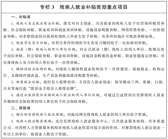 1.完善殘疾人就業(yè)創(chuàng)業(yè)法規(guī)政策。修訂實施《甘肅省殘疾人就業(yè)辦法》,制定出臺《甘肅省關(guān)于促進殘疾人就業(yè)創(chuàng)業(yè)實施意見》,保障殘疾人就業(yè)培訓(xùn)、就業(yè)服務(wù)、補貼獎勵等相關(guān)資金投入。落實殘疾人就業(yè)保障金制度,推進用人單位安排殘疾人就業(yè)。制定黨政機關(guān)、事業(yè)單位、國有企業(yè)帶頭安置殘疾人就業(yè)辦法,合理認(rèn)定按比例安排殘疾人就業(yè)形式。加強殘疾人就業(yè)促進政策與社會保障政策的銜接,納入低保范圍的已就業(yè)殘疾人可按規(guī)定在核算其家庭收入時扣減必要的就業(yè)成本,并在其家庭成員人均收入超過當(dāng)?shù)氐捅?biāo)準(zhǔn)后給予一定時間的漸退期。按照國家有關(guān)規(guī)定,對殘疾人就業(yè)先進個人和用人單位予以表彰。