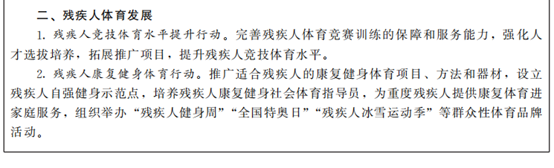 9.發(fā)展殘疾人體育事業(yè)。加快推進殘疾人體育服務(wù)納入公共體育基本服務(wù)體系,推動公共體育設(shè)施為殘疾人免費或低收費開放。加強殘疾人訓(xùn)練基地建設(shè),支持建設(shè)基層殘疾人自強健身示范點,積極開展殘健融合體育活動,豐富殘疾人康復(fù)健身體育活動,鼓勵基層組織殘疾人參加各級各類全民健身活動。大力培養(yǎng)殘疾人社會體育指導(dǎo)員,普及康復(fù)健身體育知識,推動殘疾人康復(fù)健身體育身邊化服務(wù)。大力發(fā)展殘疾人競技體育,在全國第十一屆殘運會暨第八屆特奧會、全國第十二屆殘運會暨第九屆特奧會等重大比賽中力爭好成績。辦好全省第十一屆殘運會暨第五屆特奧會和單項體育賽事。鞏固和拓展我省參加殘奧、冬奧項目。加強省殘疾人文體中心建設(shè),建設(shè)殘疾人體育人才培養(yǎng)基地,加大殘疾人文藝體育人才發(fā)現(xiàn)培養(yǎng)力度,完善殘疾人運動員訓(xùn)練體系,培養(yǎng)、輸送更多優(yōu)秀殘疾人運動員參加國內(nèi)國際殘疾人體育賽事,為我省和國家爭光。