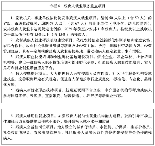 2.多渠道多形式促進(jìn)殘疾人就業(yè)創(chuàng)業(yè)。開(kāi)展殘疾人就業(yè)促進(jìn)專(zhuān)項(xiàng)行動(dòng)。各級(jí)政府機(jī)關(guān)、事業(yè)單位、國(guó)有企業(yè)應(yīng)當(dāng)拿出一定數(shù)量的崗位用于帶頭招錄(聘)和安置殘疾人就業(yè),在堅(jiān)持具有正常履行職責(zé)的身體條件前提下,對(duì)殘疾人能夠勝任的崗位,同等條件下優(yōu)先錄用殘疾人。對(duì)正式招錄(聘)殘疾人的用人單位按規(guī)定給予補(bǔ)貼扶持,對(duì)超比例安排殘疾人就業(yè)的用人單位給予獎(jiǎng)勵(lì)。實(shí)現(xiàn)殘疾人按比例就業(yè)年審全國(guó)聯(lián)網(wǎng)認(rèn)證“跨省通辦”。培育殘疾人集中就業(yè)產(chǎn)品和服務(wù)品牌,扶持帶動(dòng)殘疾人就業(yè)能力強(qiáng)的龍頭企業(yè)。落實(shí)殘疾人集中就業(yè)單位稅費(fèi)優(yōu)惠政策、政府優(yōu)先采購(gòu)等扶持政策,穩(wěn)定殘疾人集中就業(yè)。支持非營(yíng)利性殘疾人集中就業(yè)機(jī)構(gòu)持續(xù)發(fā)展。在經(jīng)營(yíng)場(chǎng)地、設(shè)施設(shè)備、社保補(bǔ)貼、金融信貸等方面扶持殘疾人自主創(chuàng)業(yè)、靈活就業(yè),鼓勵(lì)殘疾人通過(guò)新就業(yè)形態(tài)實(shí)現(xiàn)就業(yè)。支持殘疾人通過(guò)電子商務(wù)平臺(tái)實(shí)現(xiàn)就業(yè)創(chuàng)業(yè),鼓勵(lì)電子商務(wù)平臺(tái)企業(yè)在電子商務(wù)平臺(tái)設(shè)立殘疾人專(zhuān)區(qū)。支持殘疾人托養(yǎng)服務(wù)和輔助性就業(yè)發(fā)展,各地要在資金、場(chǎng)地、設(shè)施設(shè)備、無(wú)障礙改造等方面給予扶持,對(duì)開(kāi)展殘疾人托養(yǎng)服務(wù)和輔助性就業(yè)相關(guān)機(jī)構(gòu),可根據(jù)實(shí)際服務(wù)殘疾人數(shù)給予適當(dāng)補(bǔ)貼。加大公益性崗位開(kāi)發(fā)力度,殘疾人公益性崗位數(shù)量不少于人社部門(mén)開(kāi)發(fā)總量的10%。同時(shí)將不超過(guò)20%的就業(yè)保障金用于殘疾人公益性崗位社保補(bǔ)貼。加強(qiáng)實(shí)用技術(shù)培訓(xùn)、社會(huì)化生產(chǎn)服務(wù)和金融信貸支持,充分發(fā)揮農(nóng)民專(zhuān)業(yè)合作社、龍頭企業(yè)和殘疾人扶貧基地的輻射帶動(dòng)作用,確保農(nóng)村殘疾人家庭至少參與一項(xiàng)增收項(xiàng)目。加強(qiáng)農(nóng)村殘疾人家庭資產(chǎn)收益扶持,采取林權(quán)、土地承包經(jīng)營(yíng)權(quán)入股和土地流轉(zhuǎn)等方式,實(shí)現(xiàn)殘疾人家庭資產(chǎn)增值增收。全面實(shí)施《盲人醫(yī)療按摩管理辦法》。通過(guò)繼續(xù)教育、業(yè)務(wù)培訓(xùn)、職稱(chēng)評(píng)審、醫(yī)考、執(zhí)行盲人保健按摩標(biāo)準(zhǔn)、加強(qiáng)盲人按摩行業(yè)管理等多項(xiàng)措施,推進(jìn)盲人醫(yī)療、保健按摩行業(yè)規(guī)范、持續(xù)發(fā)展。為殘疾人參加職業(yè)技能培訓(xùn)、就業(yè)創(chuàng)業(yè)提供無(wú)障礙支持服務(wù)。支持手工制作等殘疾婦女就業(yè)創(chuàng)業(yè)項(xiàng)目,鼓勵(lì)殘疾人參與文化產(chǎn)業(yè)。扶持殘疾人共同居住或同一戶口家庭成員(親屬)就業(yè)創(chuàng)業(yè),實(shí)現(xiàn)“零就業(yè)”殘疾人家庭至少有1人就業(yè)。