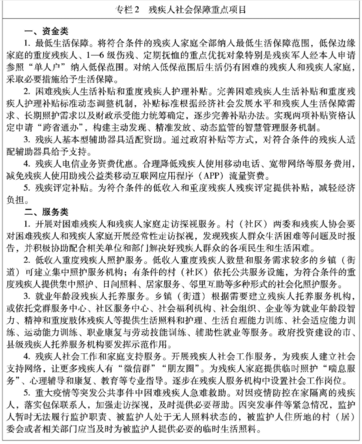 5.完善殘疾人社會(huì)福利制度和社會(huì)優(yōu)待政策。建立殘疾人“兩項(xiàng)補(bǔ)貼”動(dòng)態(tài)調(diào)整和可持續(xù)發(fā)展機(jī)制,為最低生活保障家庭中的殘疾人提供生活補(bǔ)貼,為一、二等級(jí)的重度殘疾人提供護(hù)理補(bǔ)貼。有條件的地方可將困難殘疾人生活補(bǔ)貼逐步擴(kuò)大到低保邊緣家庭殘疾人及其他困難殘疾人;重度殘疾人護(hù)理補(bǔ)貼擴(kuò)大到三、四級(jí)智力、精神殘疾人或其他殘疾人。全面開(kāi)展殘疾人“兩項(xiàng)補(bǔ)貼”資格認(rèn)定申請(qǐng)“跨省通辦”。完善殘疾人“兩項(xiàng)補(bǔ)貼”信息管理系統(tǒng),加強(qiáng)信息動(dòng)態(tài)管理,確保發(fā)放工作制度化、規(guī)范化。加強(qiáng)殘疾人“兩項(xiàng)補(bǔ)貼”制度與長(zhǎng)期護(hù)理保險(xiǎn)、老年人福利、社會(huì)救助等制度相互銜接,積極探索新的補(bǔ)貼內(nèi)容和形式,進(jìn)一步提高服務(wù)保障質(zhì)量,優(yōu)化補(bǔ)貼辦理流程。完善殘疾人“兩項(xiàng)補(bǔ)貼”監(jiān)管機(jī)制,進(jìn)一步明確各級(jí)各部門(mén)職責(zé)分工。探索對(duì)城鄉(xiāng)困難殘疾人、重度殘疾人基本型輔助器具適配給予補(bǔ)貼。提供便利條件,使殘疾人能夠攜帶輔助器具、導(dǎo)盲犬等乘坐公共交通工具、進(jìn)出公共場(chǎng)所和出入境。落實(shí)殘疾人機(jī)動(dòng)輪椅車(chē)燃油補(bǔ)貼政策。對(duì)殘疾人乘坐市內(nèi)公共交通給予優(yōu)待和便利,鼓勵(lì)鐵路、民航等為殘疾人提供優(yōu)質(zhì)優(yōu)先優(yōu)惠服務(wù)。加強(qiáng)殘疾孤兒、事實(shí)無(wú)人撫養(yǎng)殘疾兒童醫(yī)療、康復(fù)、教育等服務(wù),做好殘疾孤兒和事實(shí)無(wú)人撫養(yǎng)殘疾兒童基本生活費(fèi)與困難殘疾人生活補(bǔ)貼和重度殘疾人護(hù)理補(bǔ)貼有效銜接,達(dá)到精準(zhǔn)保障。對(duì)異地接受康復(fù)訓(xùn)練的殘疾兒童家庭給予生活補(bǔ)貼。加快建設(shè)精神衛(wèi)生福利服務(wù)體系,為特殊困難精神殘疾人提供康復(fù)、照護(hù)等服務(wù)。落實(shí)低收入殘疾人家庭生活水、電、氣、暖優(yōu)惠補(bǔ)貼政策和電信業(yè)務(wù)資費(fèi)優(yōu)惠政策。