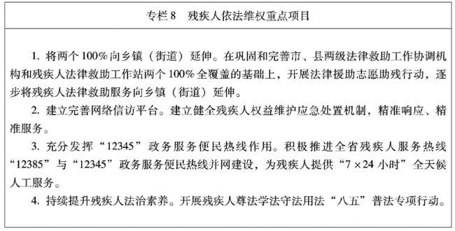 2.創(chuàng)新殘疾人法律服務(wù)和權(quán)益維護(hù)。持續(xù)開(kāi)展“法律援助惠民生”等殘疾人尊法學(xué)法守法用法專(zhuān)項(xiàng)行動(dòng),提高殘疾人掌握法律法規(guī)政策和依法維護(hù)權(quán)益的能力。將殘疾人作為公共法律服務(wù)的重點(diǎn)對(duì)象,發(fā)揮“12348”公共法律服務(wù)熱線作用,完善公共法律服務(wù)平臺(tái)無(wú)障礙功能,依據(jù)國(guó)家有關(guān)規(guī)定擴(kuò)大殘疾人法律援助覆蓋面,重點(diǎn)提升殘疾人法律援助質(zhì)量,培養(yǎng)助殘公益律師隊(duì)伍,開(kāi)展法律援助志愿助殘行動(dòng),引導(dǎo)律師、公證員、司法鑒定人、基層法律服務(wù)工作者積極履行社會(huì)責(zé)任,主動(dòng)參與公益性法律服務(wù)。堅(jiān)決打擊侵害殘疾人權(quán)益的違法犯罪行為。完善殘疾人法律救助工作協(xié)調(diào)機(jī)制,充分發(fā)揮法律救助工作站作用,為殘疾人提供及時(shí)有效的法律救助服務(wù)。加強(qiáng)對(duì)殘疾人的司法保護(hù),充分保障殘疾人行使訴訟權(quán)利,方便當(dāng)事人訴訟。發(fā)揮“12385”殘疾人服務(wù)熱線和網(wǎng)絡(luò)信訪平臺(tái)作用,建立健全殘疾人權(quán)益維護(hù)應(yīng)急處置機(jī)制。不斷拓寬殘疾人和殘疾人組織民主參與、民主協(xié)商渠道,有效保障殘疾人的知情權(quán)、參與權(quán)、表達(dá)權(quán)、監(jiān)督權(quán),支持更多殘疾人、殘疾人親友和殘疾人工作者進(jìn)入各級(jí)人大、政協(xié)并提供履職便利。鼓勵(lì)建立殘疾人矛盾糾紛人民調(diào)解組織。充分發(fā)揮人民調(diào)解組織在殘疾人矛盾糾紛排查化解中的作用,努力將矛盾糾紛化解在源頭。