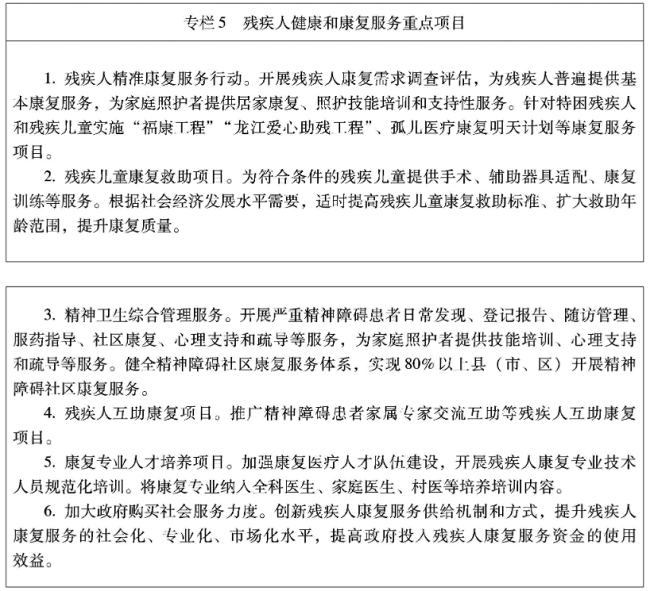 2.提升殘疾人康復(fù)服務(wù)質(zhì)量。落實(shí)《殘疾預(yù)防和殘疾人康復(fù)條例》,完善殘疾人基本康復(fù)服務(wù)目錄,繼續(xù)實(shí)施殘疾人精準(zhǔn)康復(fù)服務(wù)行動(dòng),持續(xù)實(shí)施“因人施策式”精準(zhǔn)康復(fù)服務(wù)品牌,提升康復(fù)服務(wù)質(zhì)量,滿足殘疾人基本康復(fù)服務(wù)需求,逐步實(shí)現(xiàn)“殘疾人人人享有康復(fù)服務(wù)”。持續(xù)貫徹落實(shí)殘疾兒童康復(fù)救助制度,根據(jù)社會(huì)經(jīng)濟(jì)發(fā)展水平,適時(shí)提高殘疾兒童康復(fù)救助標(biāo)準(zhǔn)、擴(kuò)大救助年齡范圍,增加康復(fù)服務(wù)供給,確保殘疾兒童得到及時(shí)有效的康復(fù)服務(wù)。廣泛開(kāi)展精神障礙社區(qū)康復(fù)。培育一批社區(qū)精神障礙康復(fù)標(biāo)桿機(jī)構(gòu),發(fā)揮示范引領(lǐng)作用。到2025年,全省80%以上的縣(市、區(qū))開(kāi)展精神障礙康復(fù)服務(wù)工作。健全綜合醫(yī)院康復(fù)醫(yī)學(xué)科、康復(fù)醫(yī)院(康復(fù)醫(yī)療中心)、基層醫(yī)療衛(wèi)生機(jī)構(gòu)三級(jí)康復(fù)醫(yī)療服務(wù)體系。加強(qiáng)殘疾人康復(fù)機(jī)構(gòu)建設(shè),推行五級(jí)康復(fù)服務(wù)平臺(tái)體系,加強(qiáng)社區(qū)康復(fù)站設(shè)施設(shè)備建設(shè)。加強(qiáng)各地康復(fù)人才培訓(xùn)工作,有計(jì)劃地培養(yǎng)學(xué)科帶頭人和技術(shù)骨干,加快培養(yǎng)高素質(zhì)、專(zhuān)業(yè)化康復(fù)人才。加強(qiáng)基層康復(fù)工作者隊(duì)伍建設(shè),將殘疾人康復(fù)和康復(fù)服務(wù)相關(guān)內(nèi)容納入衛(wèi)生健康部門(mén)全科醫(yī)生和城市社區(qū)、農(nóng)村衛(wèi)生技術(shù)人員培訓(xùn)計(jì)劃。完善全面康復(fù)業(yè)務(wù)布局,充實(shí)職業(yè)康復(fù)、社會(huì)康復(fù)、心理康復(fù)等服務(wù)功能。落實(shí)《殘疾人社區(qū)康復(fù)工作標(biāo)準(zhǔn)》,加強(qiáng)完善殘疾人社區(qū)康復(fù),建立“殘疾人康復(fù)之家”,推廣殘疾人自助、互助康復(fù),促進(jìn)康復(fù)服務(wù)市場(chǎng)化發(fā)展。支持兒童福利機(jī)構(gòu)增加和完善康復(fù)功能,配備相應(yīng)的康復(fù)設(shè)備和專(zhuān)業(yè)技術(shù)人員,與醫(yī)療機(jī)構(gòu)加強(qiáng)合作,提高康復(fù)醫(yī)療服務(wù)能力。加強(qiáng)康復(fù)學(xué)科建設(shè)和科學(xué)技術(shù)研究,發(fā)揮中醫(yī)藥在康復(fù)中的獨(dú)特優(yōu)勢(shì),為有康復(fù)需求的人群提供優(yōu)質(zhì)中醫(yī)康復(fù)服務(wù)。到2025年,力爭(zhēng)建成3個(gè)省級(jí)中醫(yī)康復(fù)中心,建立3個(gè)省級(jí)中醫(yī)康復(fù)技術(shù)推廣基地。