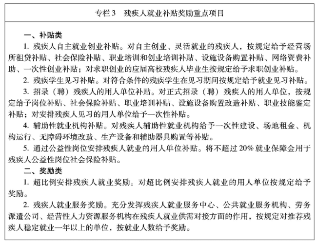 1.完善殘疾人就業(yè)創(chuàng)業(yè)法規(guī)政策。全面落實(shí)《殘疾人就業(yè)條例》。落實(shí)殘保金征收使用管理、扶持殘疾人自主就業(yè)創(chuàng)業(yè)和完善殘保金制度促進(jìn)殘疾人就業(yè)等殘疾人就業(yè)支持政策,保障殘疾人就業(yè)培訓(xùn)、獎(jiǎng)勵(lì)補(bǔ)貼、就業(yè)服務(wù)等相關(guān)資金投入。完善殘疾人按比例就業(yè)制度,合理認(rèn)定按比例安排殘疾人就業(yè)形式。完善用人單位按比例安排殘疾人就業(yè)公示制度。強(qiáng)化殘疾人就業(yè)支持政策與社會(huì)保障政策有效銜接,嚴(yán)格執(zhí)行納入低保范圍的已就業(yè)殘疾人及其家庭成員人均收入超過(guò)當(dāng)?shù)氐捅?biāo)準(zhǔn)后給予一定時(shí)間的漸退期。