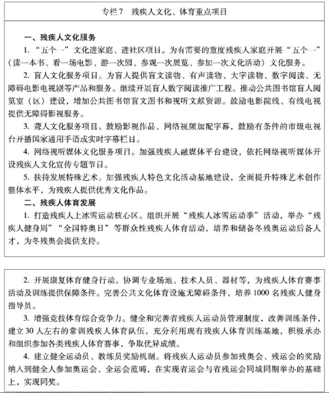 7.普及殘疾人公共文化服務(wù)和群眾性文化活動(dòng)。將殘疾人文化服務(wù)納入城鄉(xiāng)公共文化服務(wù)體系建設(shè)。鼓勵(lì)殘疾人參加“書(shū)香中國(guó)、閱讀有我”和“書(shū)香龍江”等公共文化活動(dòng),支持開(kāi)展“殘疾人文化周”等殘疾人群眾性文化活動(dòng)。推動(dòng)基層建設(shè)100個(gè)殘健融合文化服務(wù)中心(站、點(diǎn)),進(jìn)一步推進(jìn)為盲人、聾人提供無(wú)障礙文化服務(wù)。鼓勵(lì)殘疾人參與文化藝術(shù)創(chuàng)作和非物質(zhì)文化遺產(chǎn)傳承,滿足殘疾人文化需求、增強(qiáng)殘疾人精神力量。鼓勵(lì)省、市廣播電視臺(tái)、網(wǎng)絡(luò)視聽(tīng)媒體和融媒體中心開(kāi)設(shè)殘疾人專(zhuān)題節(jié)目,鼓勵(lì)有條件的電視臺(tái)開(kāi)播國(guó)家通用手語(yǔ)或提供實(shí)時(shí)字幕欄目。加強(qiáng)殘疾人特殊藝術(shù)人才和特殊藝術(shù)師資培養(yǎng),發(fā)展特殊藝術(shù)。鼓勵(lì)殘疾人進(jìn)行文學(xué)藝術(shù)創(chuàng)作,推動(dòng)殘疾人文化產(chǎn)業(yè)發(fā)展,打造殘疾人文化藝術(shù)品牌。參加全國(guó)殘疾人藝術(shù)匯演,舉辦全省殘疾人特殊藝術(shù)匯報(bào)演出。鼓勵(lì)殘疾人參加傳統(tǒng)工藝美術(shù)學(xué)習(xí)和創(chuàng)作生產(chǎn)。實(shí)施殘疾人文化進(jìn)家庭“五個(gè)一”項(xiàng)目5000戶,幫助有文化需求的重度殘疾人家庭每年讀一本書(shū)、看一次電影、游一次園、參觀一次展覽、參加一次文化活動(dòng)。