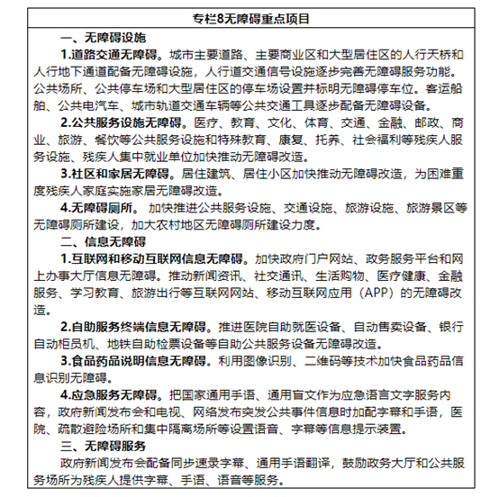 30.提升無障礙設(shè)施建設(shè)管理水平。新建設(shè)施嚴格執(zhí)行《無障礙通用規(guī)范》等標準。在鄉(xiāng)村建設(shè)行動、城市更新行動中統(tǒng)籌推進無障礙設(shè)施建設(shè)和改造,老舊小區(qū)改造和社區(qū)建設(shè)同步開展無障礙改造。城市道路、公共交通、社區(qū)服務(wù)設(shè)施、公共服務(wù)設(shè)施和殘疾人服務(wù)設(shè)施、殘疾人集中就業(yè)單位等加快開展無障礙設(shè)施建設(shè)和改造。公共停車區(qū)按規(guī)定在方便殘疾人通行位置設(shè)立無障礙停車位。繼續(xù)實施困難重度殘疾人家庭無障礙改造工程,將農(nóng)村無障礙環(huán)境改造納入鄉(xiāng)村振興建設(shè)規(guī)劃內(nèi)容,加快推廣無障礙廁所。提高全社會無障礙意識,加強無障礙設(shè)施日常維護管理和監(jiān)督使用,保障殘疾人、老年人無障礙等通行安全和使用便利。