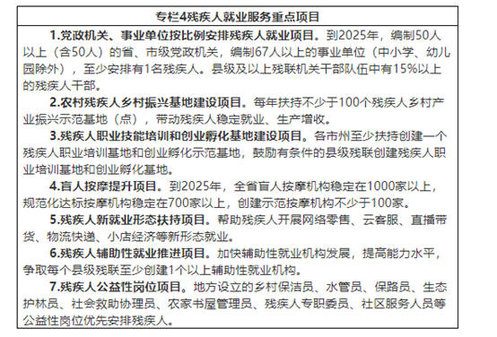 13. 深入開展殘疾人創(chuàng)業(yè)就業(yè)行動。加大支持力度,創(chuàng)新工作舉措,促進殘疾人多渠道多形式就業(yè)創(chuàng)業(yè)。穩(wěn)定殘疾人集中就業(yè),落實殘疾人集中就業(yè)單位稅費優(yōu)惠、政府優(yōu)先采購扶持政策,支持非營利性殘疾人集中就業(yè)機構(gòu)持續(xù)發(fā)展。加大輔助性就業(yè)機構(gòu)支持保障力度,組織智力、精神和重度肢體殘疾人就近就便從事生產(chǎn)勞動、進行職業(yè)康復(fù)。公益性崗位優(yōu)先安排符合條件的殘疾人就業(yè),對補貼期滿后仍然難以通過其他渠道實現(xiàn)就業(yè)的殘疾人,可再次按程序通過城鎮(zhèn)公益性崗位予以安置,累計安置次數(shù)原則上不超過2次。扶持殘疾人自主創(chuàng)業(yè)、靈活就業(yè),加強殘疾人在網(wǎng)絡(luò)直播帶貨、網(wǎng)絡(luò)零售、云客服、居家就業(yè)、非遺傳承、鄉(xiāng)村(家庭)旅游等新業(yè)態(tài)新模式就業(yè)。整合各級殘疾人孵化基地、產(chǎn)業(yè)振興基地、就業(yè)創(chuàng)業(yè)示范基地等資源,建設(shè)一批高水平的殘疾人創(chuàng)業(yè)就業(yè)基地。按照規(guī)范化、專業(yè)化、品牌化要求推進盲人按摩行業(yè)發(fā)展,加快省級盲人按摩醫(yī)院建設(shè),拓寬盲人在醫(yī)療衛(wèi)生機構(gòu)、互聯(lián)網(wǎng)服務(wù)等領(lǐng)域就業(yè)渠道。為聾人參加職業(yè)培訓(xùn)、就業(yè)創(chuàng)業(yè)提供無障礙支持服務(wù)。扶持殘疾人親屬就業(yè)創(chuàng)業(yè),實現(xiàn)零就業(yè)殘疾人家庭至少1人就業(yè)。