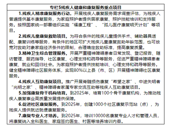18.強化殘疾人康復(fù)服務(wù)。繼續(xù)實施殘疾人精準康復(fù)服務(wù)行動,增加供給,提高質(zhì)量,滿足殘疾人基本康復(fù)服務(wù)需求。全面落實殘疾兒童康復(fù)救助制度,合理確定康復(fù)救助標準,確保殘疾兒童得到及時有效的康復(fù)服務(wù)。加強社區(qū)康復(fù)工作,將其納入各地鄉(xiāng)村振興建設(shè)整體規(guī)劃,統(tǒng)籌整合各類醫(yī)療衛(wèi)生、養(yǎng)老、康復(fù)和托養(yǎng)等資源,探索建立社區(qū)殘疾人康復(fù)示范站(點)。加強精神衛(wèi)生綜合管理,廣泛開展精神障礙社區(qū)康復(fù)。健全綜合醫(yī)院康復(fù)醫(yī)學(xué)科、康復(fù)醫(yī)院(康復(fù)醫(yī)療中心)、基層醫(yī)療衛(wèi)生機構(gòu)三級康復(fù)醫(yī)療服務(wù)體系。加強殘疾人康復(fù)機構(gòu)建設(shè),完善全面康復(fù)業(yè)務(wù)布局,充實職業(yè)康復(fù)、社會康復(fù)、心理康復(fù)等服務(wù)功能。加快貴州省康復(fù)醫(yī)院建設(shè),探索康復(fù)、托養(yǎng)結(jié)合發(fā)展新模式。加強康復(fù)服務(wù)標準體系建設(shè),建立康復(fù)機構(gòu)定點準入、動態(tài)退出機制。加強康復(fù)學(xué)科建設(shè)和專業(yè)人才培養(yǎng),發(fā)揮中醫(yī)藥在康復(fù)中的獨特優(yōu)勢,推動康復(fù)服務(wù)高質(zhì)量發(fā)展。