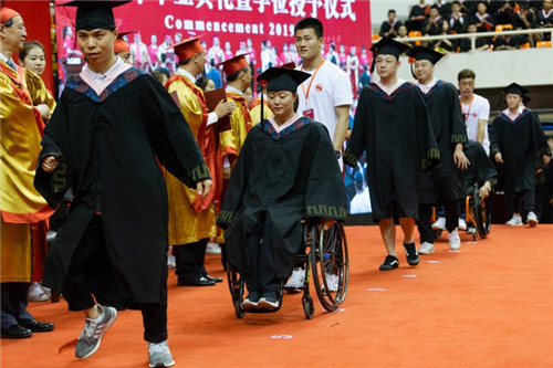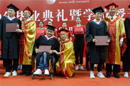6月27日上午,2019屆殘奧冠軍班學(xué)生在北京體育大學(xué)體育館參加2019年畢業(yè)典禮暨學(xué)位授予儀式,11名來自乒乓球、游泳、舉重和輪椅網(wǎng)球項目的首屆殘奧冠軍班學(xué)生順利畢業(yè)。
