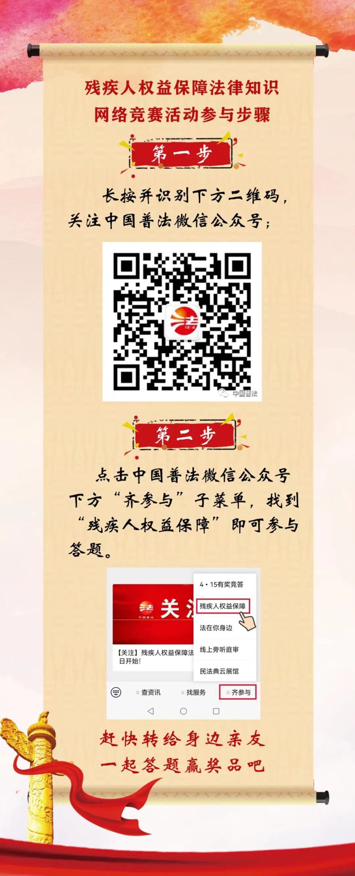 參賽者打開手機(jī)微信,搜索“中國普法”微信公眾號,或掃描活動海報上的二維碼,進(jìn)入公眾號,點(diǎn)擊右下方“齊參與”,選擇“殘疾人權(quán)益保障”欄目進(jìn)入答題。