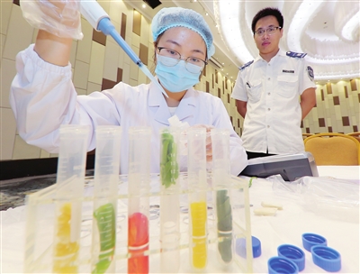 ①食品安全檢測(cè)人員現(xiàn)場(chǎng)對(duì)當(dāng)日食材進(jìn)行農(nóng)藥殘留檢測(cè)。