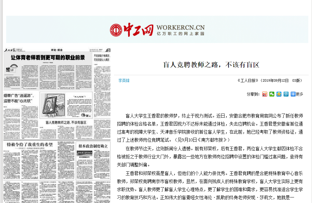 工人日報(bào) 盲人競聘教師之路,不該有盲區(qū)