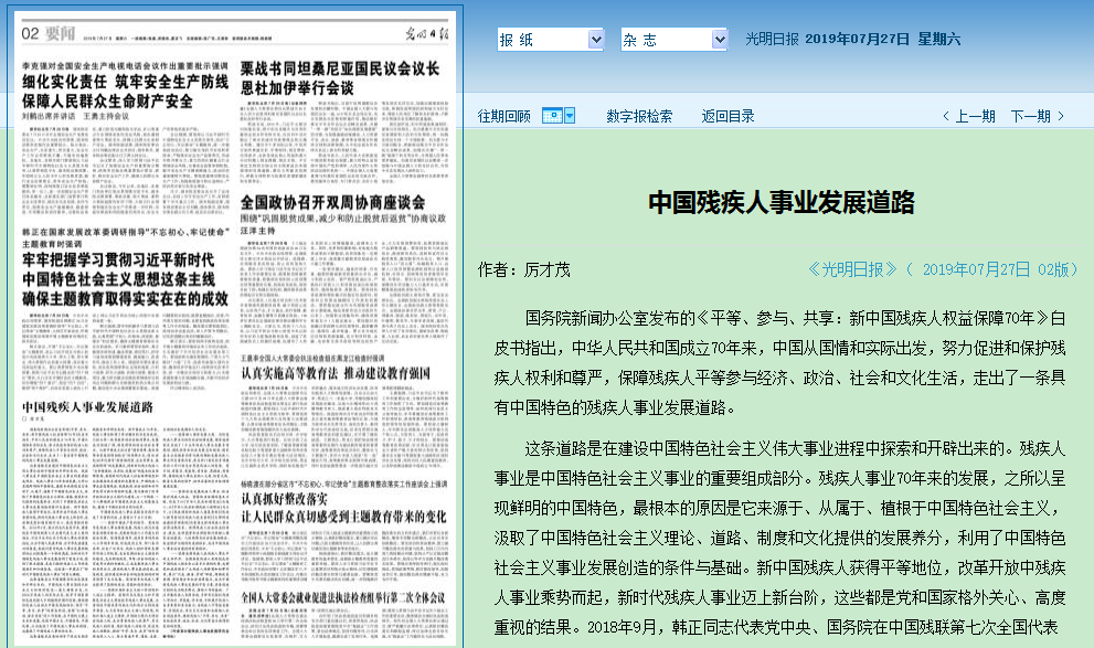 光明日報 中國殘疾人事業(yè)發(fā)展道路