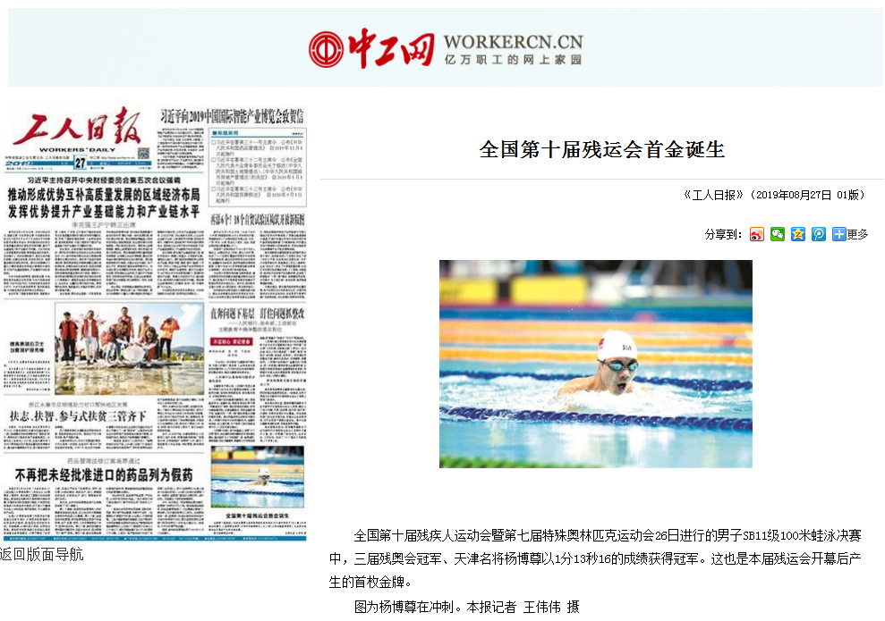 工人日報 全國第十屆殘運會首金誕生