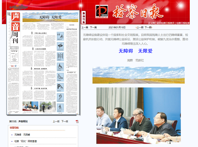 張軍檢察長對無障礙公益訴訟的高度重視,讓呂世明備受鼓舞,他表示,殘聯(lián)組織將配合檢察機(jī)關(guān)做好相應(yīng)工作,會同有關(guān)部門形成調(diào)研成果專報(bào),進(jìn)行課題調(diào)研,為無障礙環(huán)境建設(shè)立法提供支撐,推進(jìn)無障礙環(huán)境法治保障體系建設(shè)。