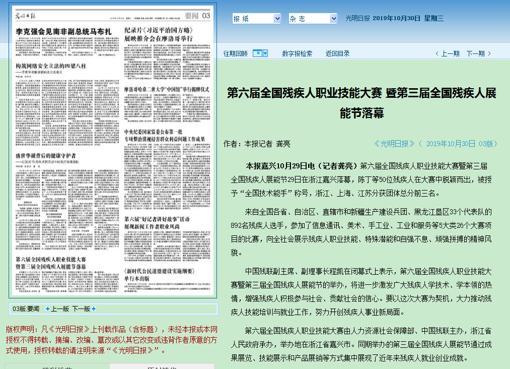 光明日報(bào) 第六屆全國殘疾人職業(yè)技能大賽 暨第三屆全國殘疾人展能節(jié)落幕