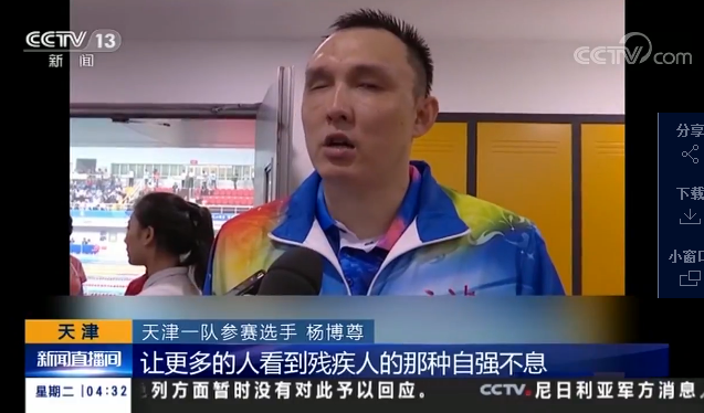 中央電視臺(tái)《新聞直播間》關(guān)注全國第十屆殘運(yùn)會(huì)暨第七屆特奧會(huì) 楊博尊奪得首枚金牌