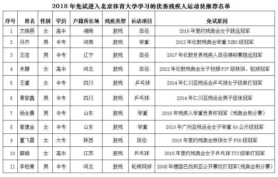 根據(jù)教育部《關(guān)于同意北京體育大學免試招收優(yōu)秀殘疾人運動員的函》(教學函〔2015〕5號)和北京體育大學《北京體育大學2018年免試試點招收優(yōu)秀殘疾人運動員招生簡章》,經(jīng)審核,2018年擬推薦以下11名優(yōu)秀殘疾人運動員免試進入北京體育大學運動訓練專業(yè)本科學習。現(xiàn)將推薦名單公示如下: