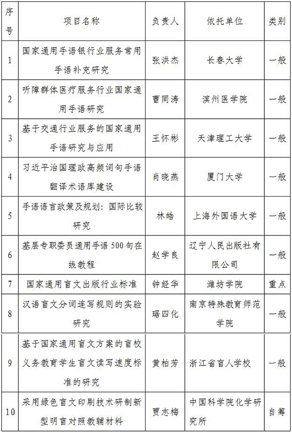 根據(jù)《中國(guó)殘聯(lián)手語(yǔ)和盲文項(xiàng)目管理辦法(試行)》,經(jīng)專(zhuān)家函評(píng)和會(huì)議審議,2019年度中國(guó)殘聯(lián)手語(yǔ)盲文項(xiàng)目擬立項(xiàng)10項(xiàng),其中手語(yǔ)6項(xiàng),盲文4項(xiàng)。具體項(xiàng)目清單如下:
