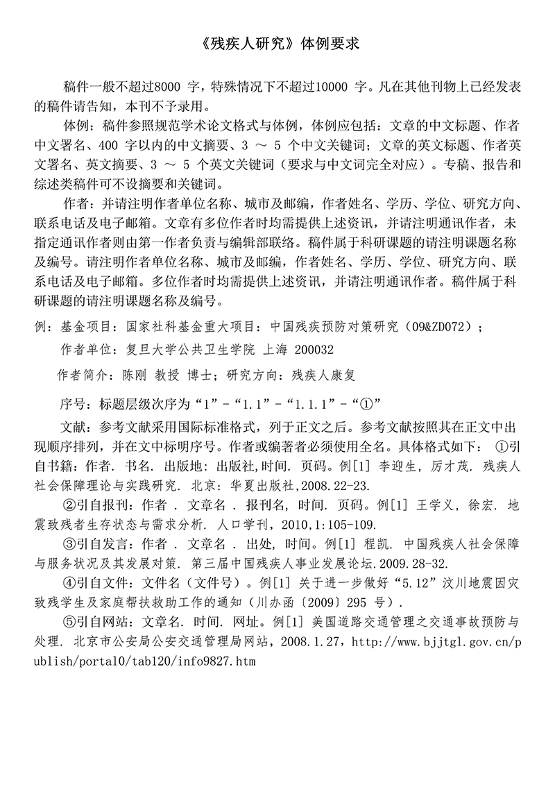 2.稿件內(nèi)容應當符合基本學術(shù)規(guī)范,具體體例要求參照“《殘疾人研究》體例要求”(見附件)。不用提供英文標題、作者英文署名、英文摘要、英文關(guān)鍵詞。如獲推薦在《殘疾人研究》發(fā)表,另行提供。
